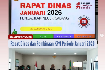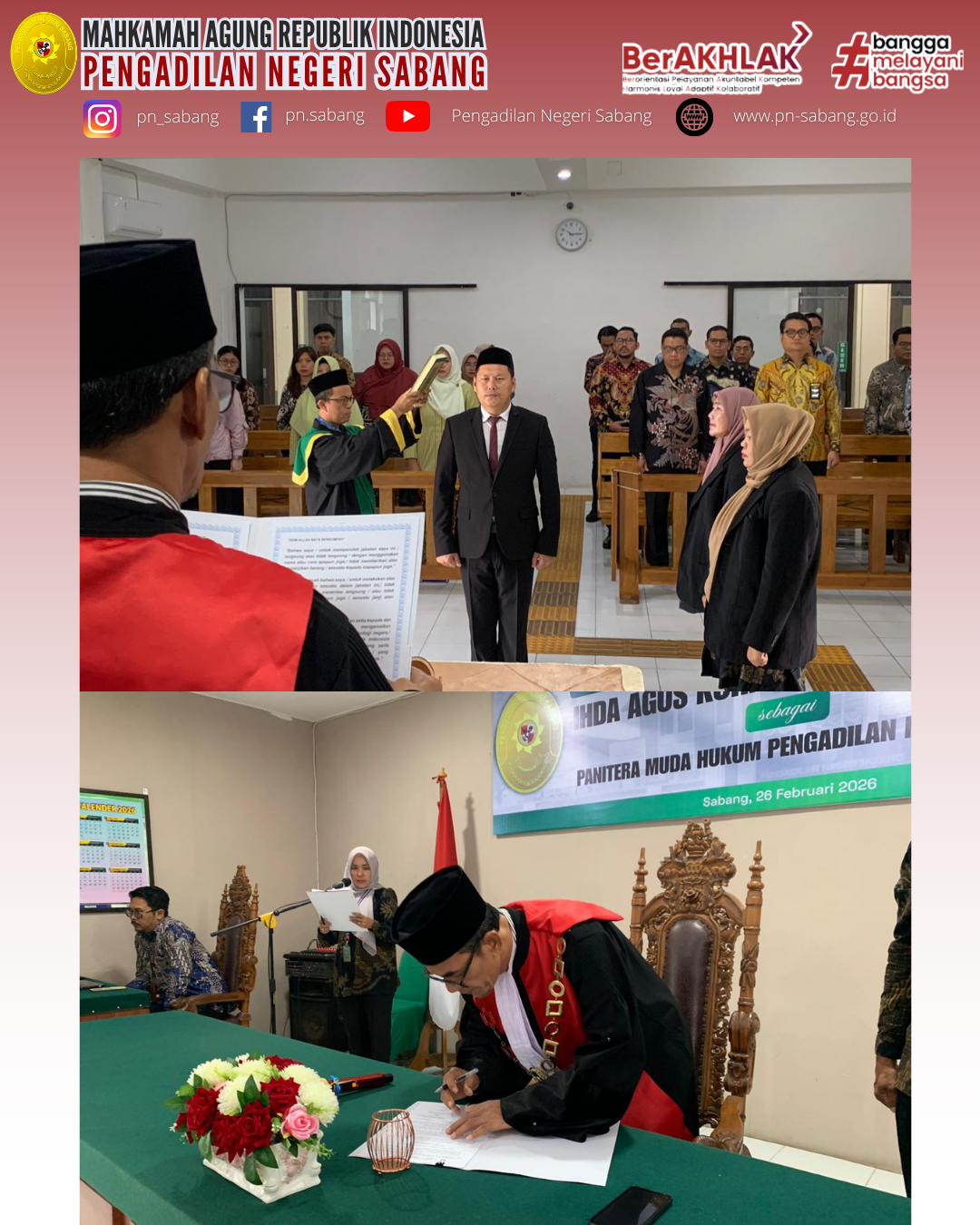 Pengadilan Negeri Sabang melaksanakan Acara Pengambilan Sumpah Jabatan dan Pelantikan Panitera Muda Hukum, Ihda Agus Kurniawan, S.Sos.,S.H. yang diambil sumpahnya oleh Ketua Pengadilan Negeri Sabang, Maimunsyah, S.H.,M.H. pada hari kamis, 26 Februari 2026. Acara berlangsung khidmat dan tertib